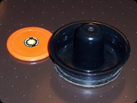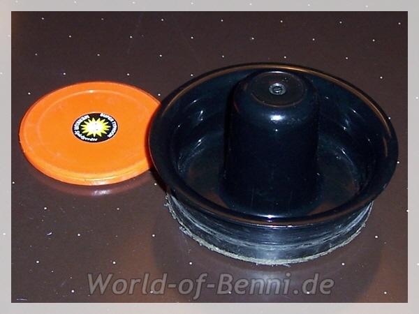 Air-Hockey besteht aus einem Tisch mit 2 Toren und Torzähler, einem Puck und 2 Paddles (Schlägern).